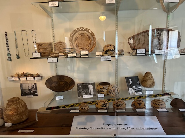 “Shaped & Woven-Enduring Connections with Stone, Fiber & Beadwork” is on view at Trinidad Museum. The exhibit includes caps, baskets, jewelry, stone implements, regalia and two model redwood canoes from the museum’s permanent collections and new acquisitions. Ron and Melanie Johnson, Kirsten Trump, Kathy Heil and Janet Eldridge recently added caps and baskets to the museum collections and some of these are on display. Carita Dooley & Alexandra Cox, curators. The Clarke Historical Museum loaned pedestals to display some of the larger baskets and Carita painted them to harmonize with the exhibit.